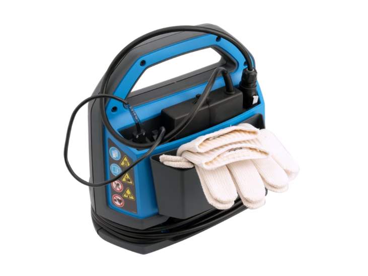 El dispositivo es casi silencioso y pesa solo 3 kg, gracias, sobre todo, al uso de una sofisticada tecnología de frecuencia media. Dispone de una pinza de inducción con bobinas internas. La corriente en las bobinas genera un campo magnético fluctuante. Esto induce corrientes en el componente, produciendo calor. Como este calor se genera en el componente, no en la pinza, el proceso es muy eficaz.